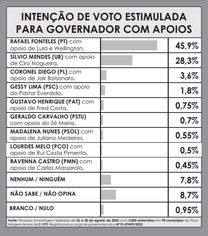 Nesse cenário, ao se considerar os brancos/nulos e os indecisos, Rafael Fonteles (PT) com os apoios do candidato a presidente Lula e do candidato a senador Wellington Dias, soma 45,9% das intenções de voto.