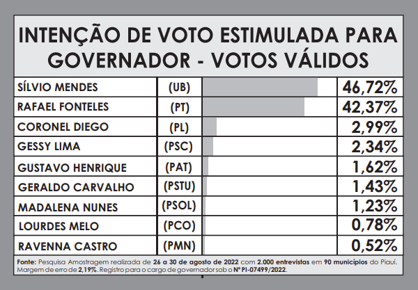 FICHA TÉCNICA - A Pesquisa Amostragem foi realizada no período de 26 a 30 de agosto de 2022 com 2.000 entrevistas em 90 municípios do Piauí. A margem de erro é de 2,19%. O registro para o cargo de governador está sob o Nº PI-07499/2022.