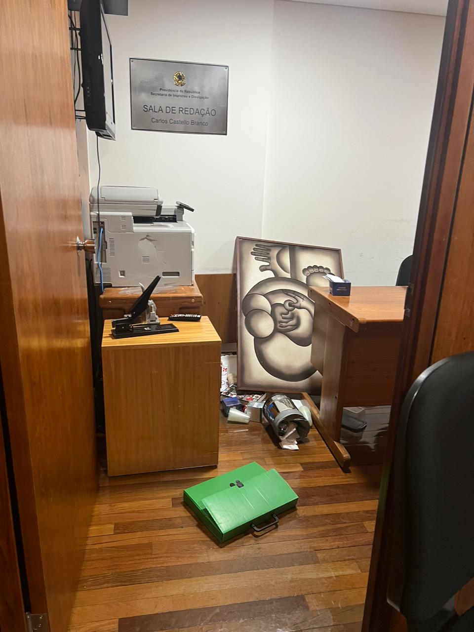 Os extremistas seguiram para o Palácio do Planalto sem enfrentar resistência por parte de forças de segurança pública. Eles entraram pela mesma rampa que Lula subiu para tomar posse o domingo passado (1º). Golpistas que estavam no segundo andar quebraram os vidros e gritavam para os demais entrarem. A tela "Mulatas", do artista plástico brasileiro Di Cavalcanti, foi rasgada em ao menos três locais diferentes.