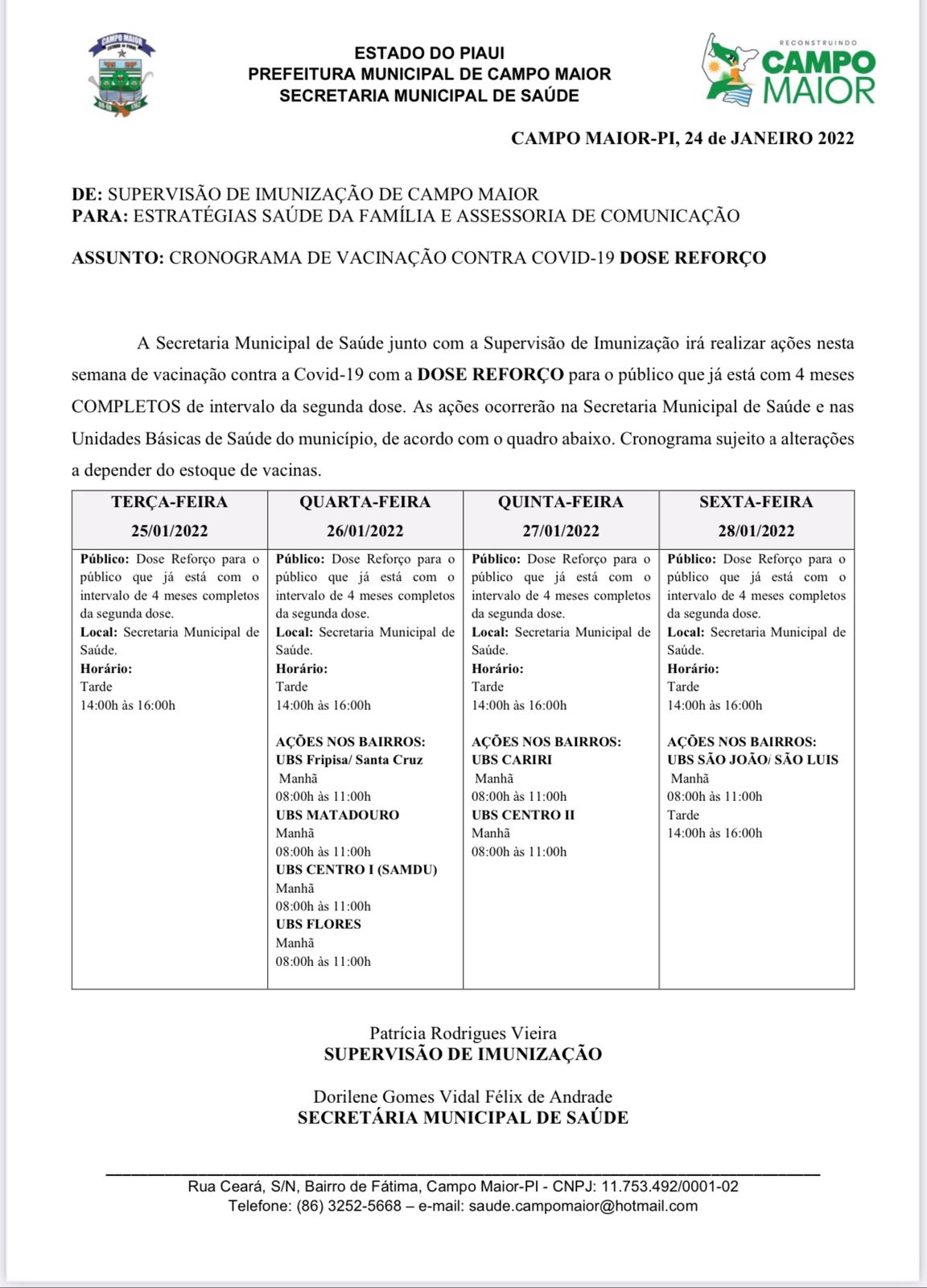 Através da Secretaria Municipal de Saúde, Campo Maior dá prosseguimento à vacinação contra a Covid-19 nesta segunda-feira (24). O imunizante da Pfizer será disponibilizado na Secretaria de Saúde, apenas durante a tarde, das 14h às 16h. A supervisora de imunização, Patrícia Rodrigues, esclarece que mesmo quem tomou a vacina da AstraZeneca também poderá receber a dose da Pfizer.