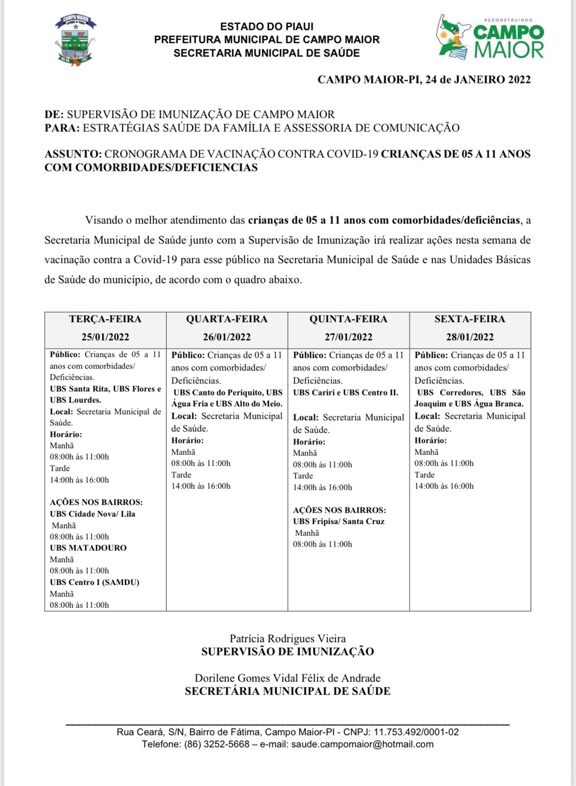Já a vacinação de crianças segue tendo como prioridade os grupos de risco e inicia na terça-feira (24), das 08h às 11h e das 14h às 16h, nas UBSs dos bairros. Os responsáveis devem levar laudo médico da criança. Confira abaixo os calendários: