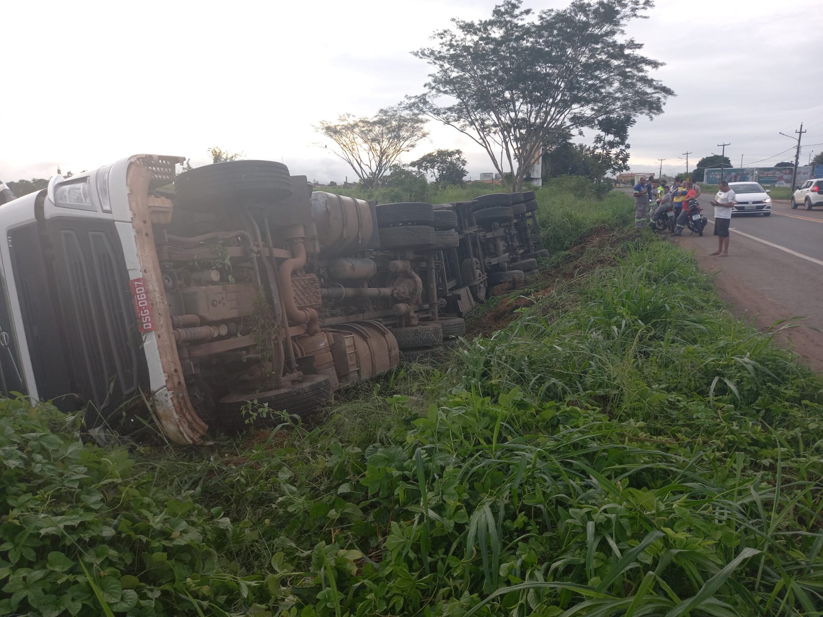 A carreta carregada de cerveja saiu da pista num trecho onde os veículos tráfego em baixa velocidade.