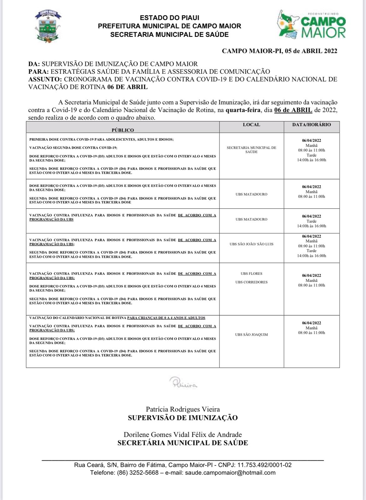 Tem início nesta quarta-feira (6), através da Secretaria Municipal de Saúde, a campanha de vacinação contra a gripe no município de Campo Maior. Os grupos contemplados nesta primeira etapa são idosos e profissionais da saúde. A campanha de imunização contra a Covid-19 também prossegue.