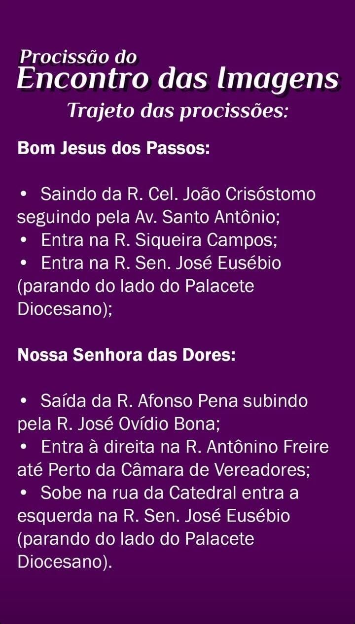 O encontro das imagens, por sua vez, acontecerá em frente ao Palacete Diocesano Monsenhor Mateus Cortez Rufino.