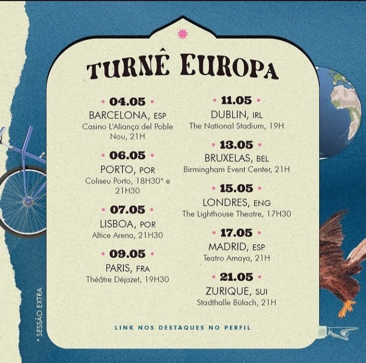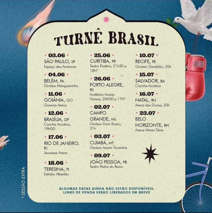 A turnê passará por cidades do Brasil, inclusive no Piauí, e terá shows pela Europa. Confira: