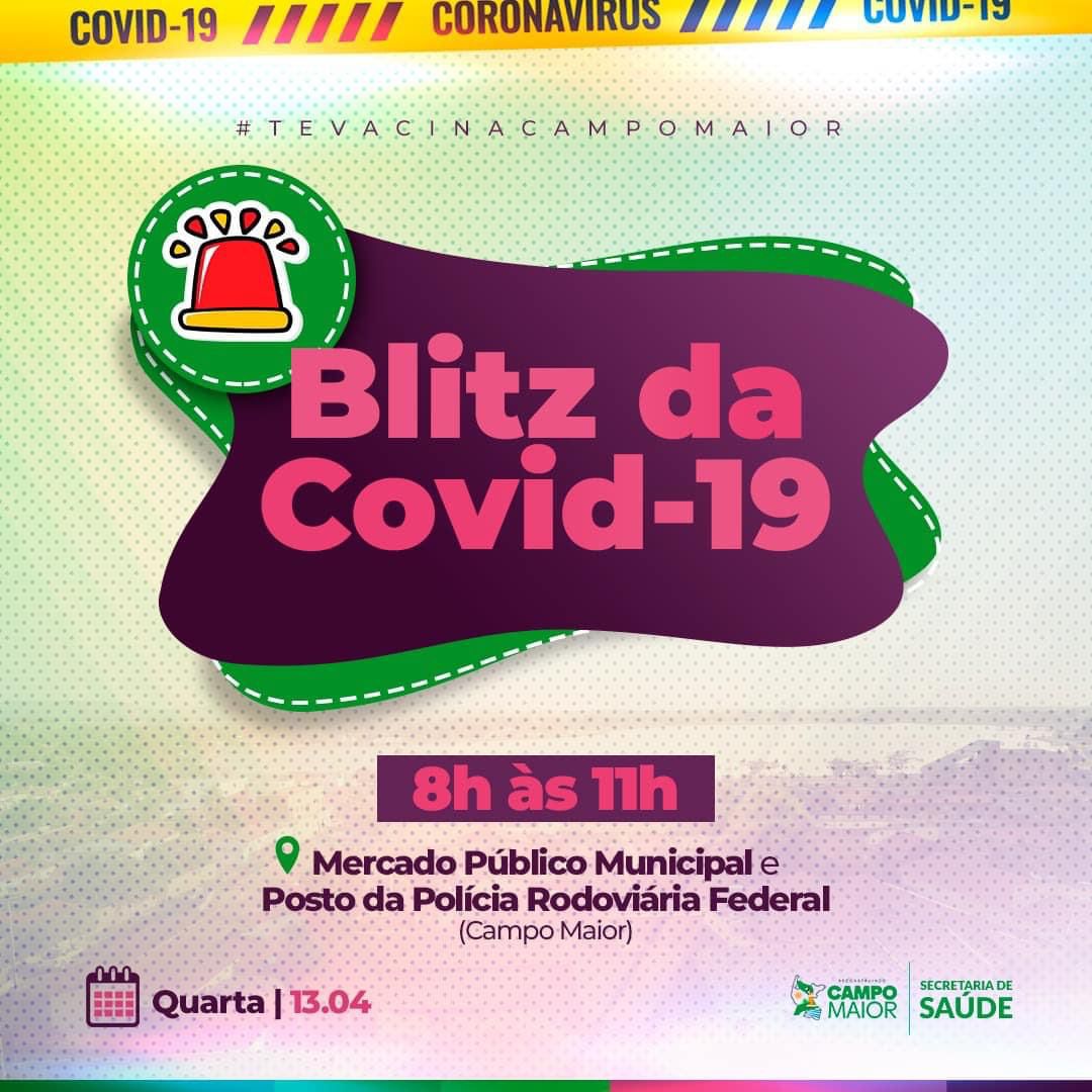 A Secretaria Municipal de Saúde de Campo Maior (SMS) realizará uma nova blitz da vacinação contra a Covid-19 nesta quarta-feira (13). Desta vez os locais serão o Mercado Público Municipal e o posto da Polícia Rodoviária Federal.