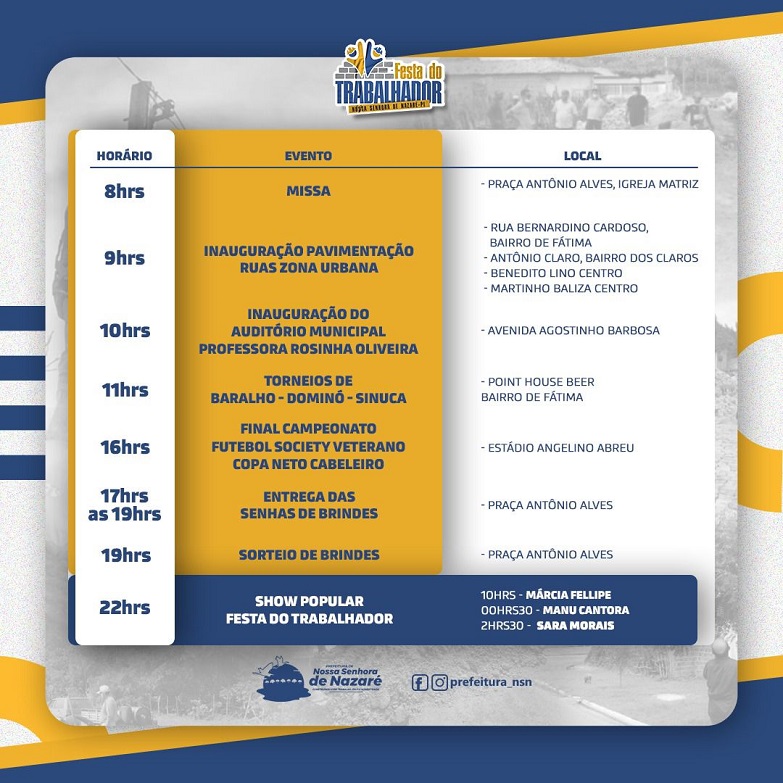 A prefeitura de Nossa Senhora de Nazaré divulgou a programação da Festa do Trabalhador de 2022. A comemoração acontece no próximo dia 1º de maio e é a mais tradicional e aguardada por todos do município.