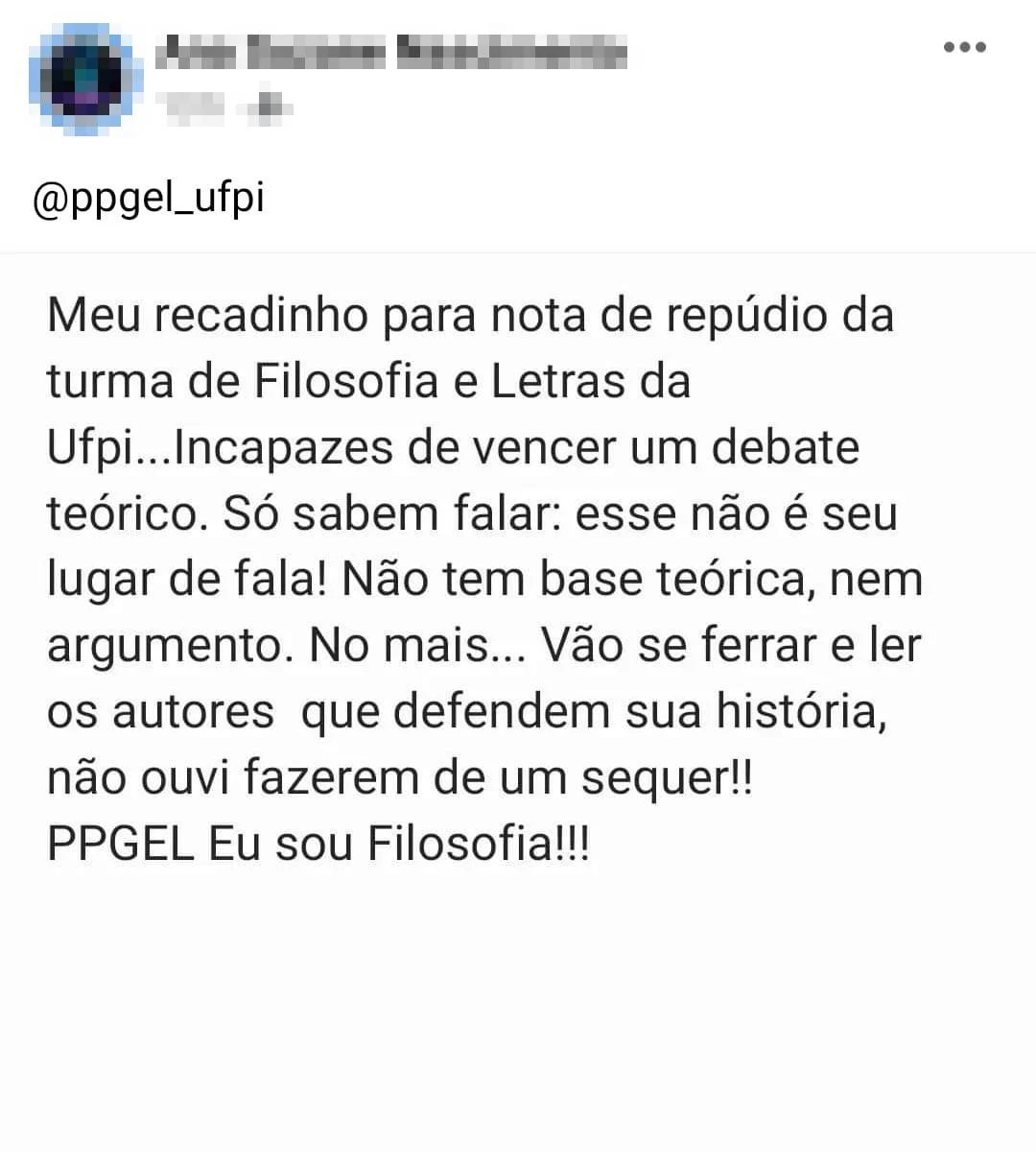 Nas redes sociais, a colega apontada respondeu à nota de repúdio da turma, dizendo que os alunos são 'incapazes de vencer um debate teórico. "Meu recadinho para nota de repúdio da turma de Filosofia e Letras da UFPI.... incapazes de vencer um debate teórico. Só sabendo falar: esse não é seu lugar de fala! Não tem base teórica, nem argumento. No mais... Vão se ferrar e ler os autores que defendem sua história, nao ouvi fazerem de um sequer!! PPGEL Eu sou Filosofia!!!", escreveu.