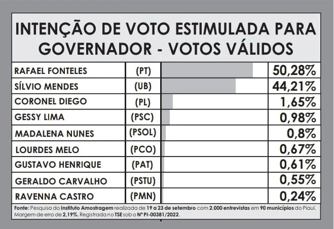 O Instituto Amostragem divulgou nova pesquisa para o Governo do Piauí nesta segunda-feira (26). O candidato Rafael Fonteles (PT) ampliou a vantagem na disputa pelo Palácio de Karnak na pesquisa de intenção de voto estimulada., considerando somente os votos válidos, ou seja, quando se exclui os brancos, nulos e indecisos.