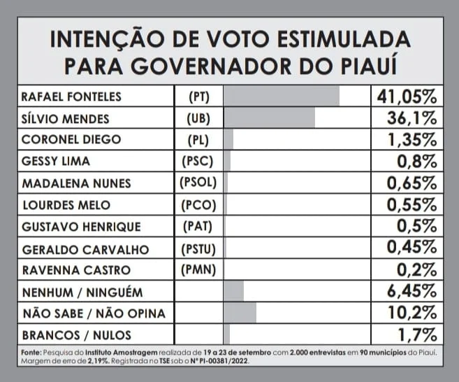 A Pesquisa Amostragem foi realizada no período de 19 a 23 de setembro de 2022 com 2.000 entrevistas em 90 municípios do Piauí. A margem de erro é de 2,19%. O registro para o cargo de governador está sob o Nº PI-00381/2022.