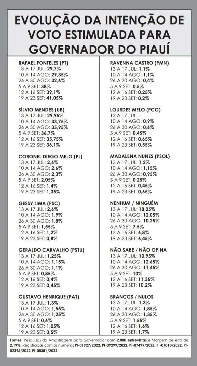 No comparativo com o levantamento feito entre os dias 12 e 16 de setembro, Rafael Fonteles e Silvio Mendes oscilaram dentro da margem de erro de 2,19%.