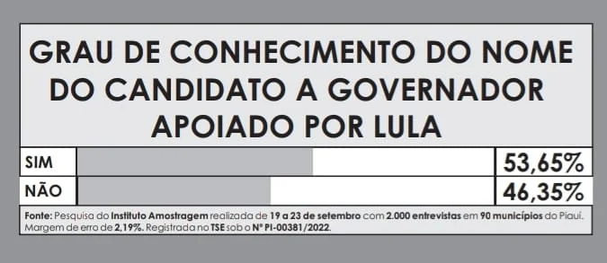 O levantamento do Amostragem também mensurou o grau de conhecimento do candidato apoiado pelo ex-presidente Luiz Inácio Lula da Silva; nesse sentido, 53,65% apontaram que conhecem o pleiteante ao Governo do Piauí apoiado pelo presidenciável petista; enquanto 46,35% indicaram que não conhecem.