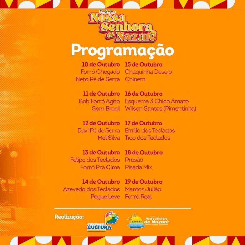 Entre os dias 10 e 20 de outubro acontece, em Nossa Senhora de Nazaré, o festejo da padroeira que dá nome ao município. A programação completa também foi divulgada.