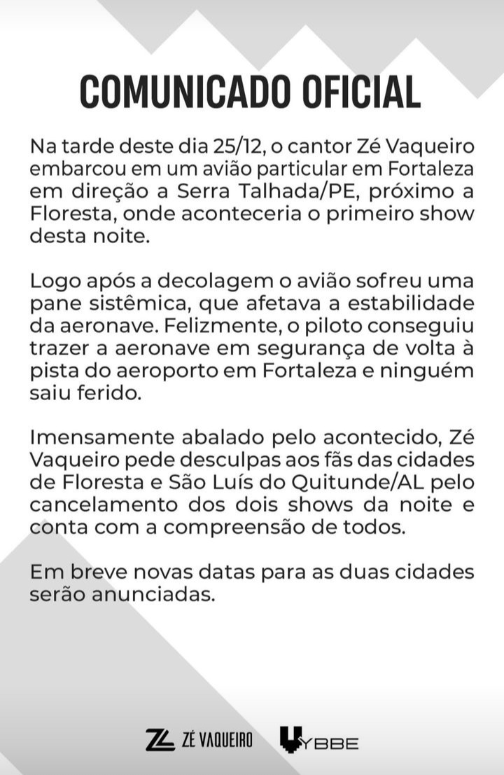 “Muita gente ‘tá’ perguntando o que foi que aconteceu. (...) Quando a gente decolou, que a gente chegou lá em cima, o sistema que deixa o avião plano, enquanto está voando, parou de funcionar. A gente teve que retornar. Graças a Deus a gente ‘tava’ perto do aeroporto de Fortaleza”, disse o cantor em seu Instagram.