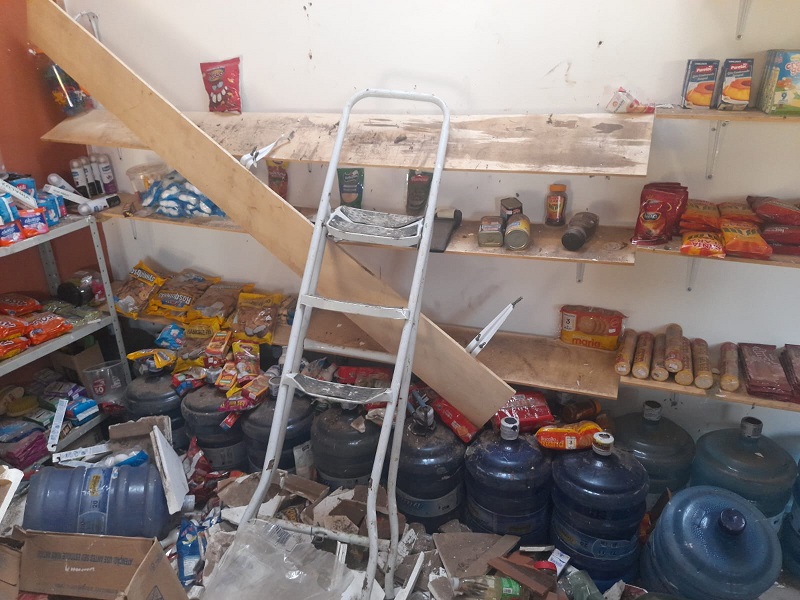Alberto, proprietário do estabelecimento, explica que ao abrir por volta das 7h da manhã de hoje (4) ele constatou que o(s) responsável (eis) tiraram as telhas e quebraram o forro de gesso. Em seguida ele(s) pisaram nas prateleiras de mercadoria, que acabaram quebrando.