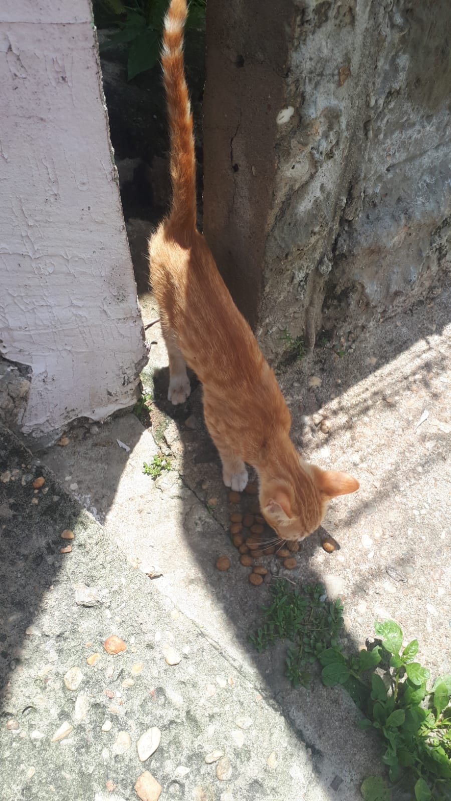 O felino está recebendo comida de moradores da região, mas precisa de adoção.