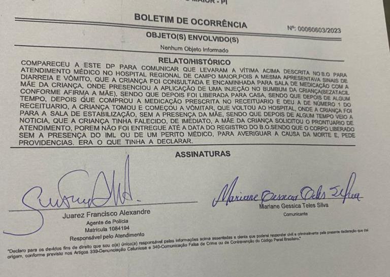 “Ela foi consultada e o médico passou uma medicação para criança. Medicação essa que a mãe (Antônia Natália Pereira da Silva) não tem conhecimento de qual era. De começo disseram que era uma benzetacil. Já no final, depois da criança morta, disseram que aplicaram apenas uma bromoprida e uma dipirona. A criança foi liberada para casa”, explicou a familiar.