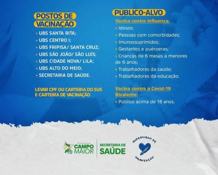 A Secretaria Municipal de Saúde de Campo Maior irá realizar o Dia D da Vacinação no próximo sábado (20.05), das 08h às 17h, quando serão ofertados imunizantes contra a Influenza e a bivalente da Covid-19.