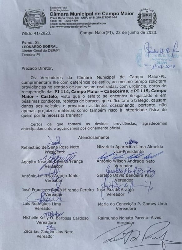 “Estou hoje atendendo a solicitação de todos os vereadores da Câmara de Campo Maior, representando nossa população, haja visto que estas rodovias cortam a grande região do território dos carnaubais. As PI's 114 e 115 interligam Campo Maior aos municípios de Cabeceiras e Castelo, e o atual estado delas representa risco ao tráfego e à integridade das pessoas", disse Dogim Félix.