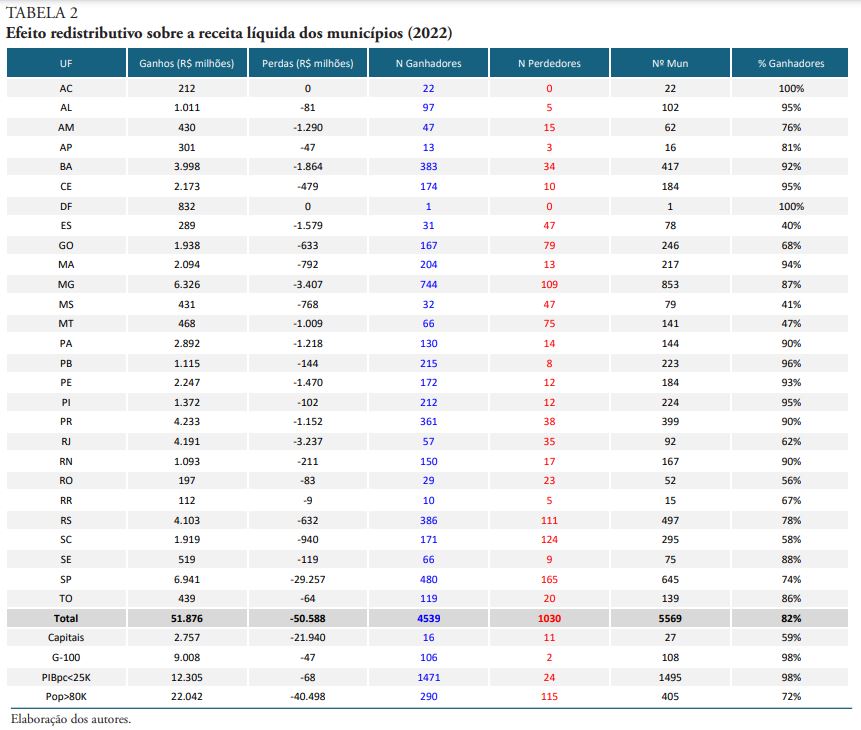 A análise leva em consideração a substituição do ICMS por um imposto estadual no destino, a redistribuição da cota-parte municipal do imposto estadual com base em novos critérios (população é o principal deles) e a substituição do ISS por um tributo municipal de base ampla e também cobrado no destino.