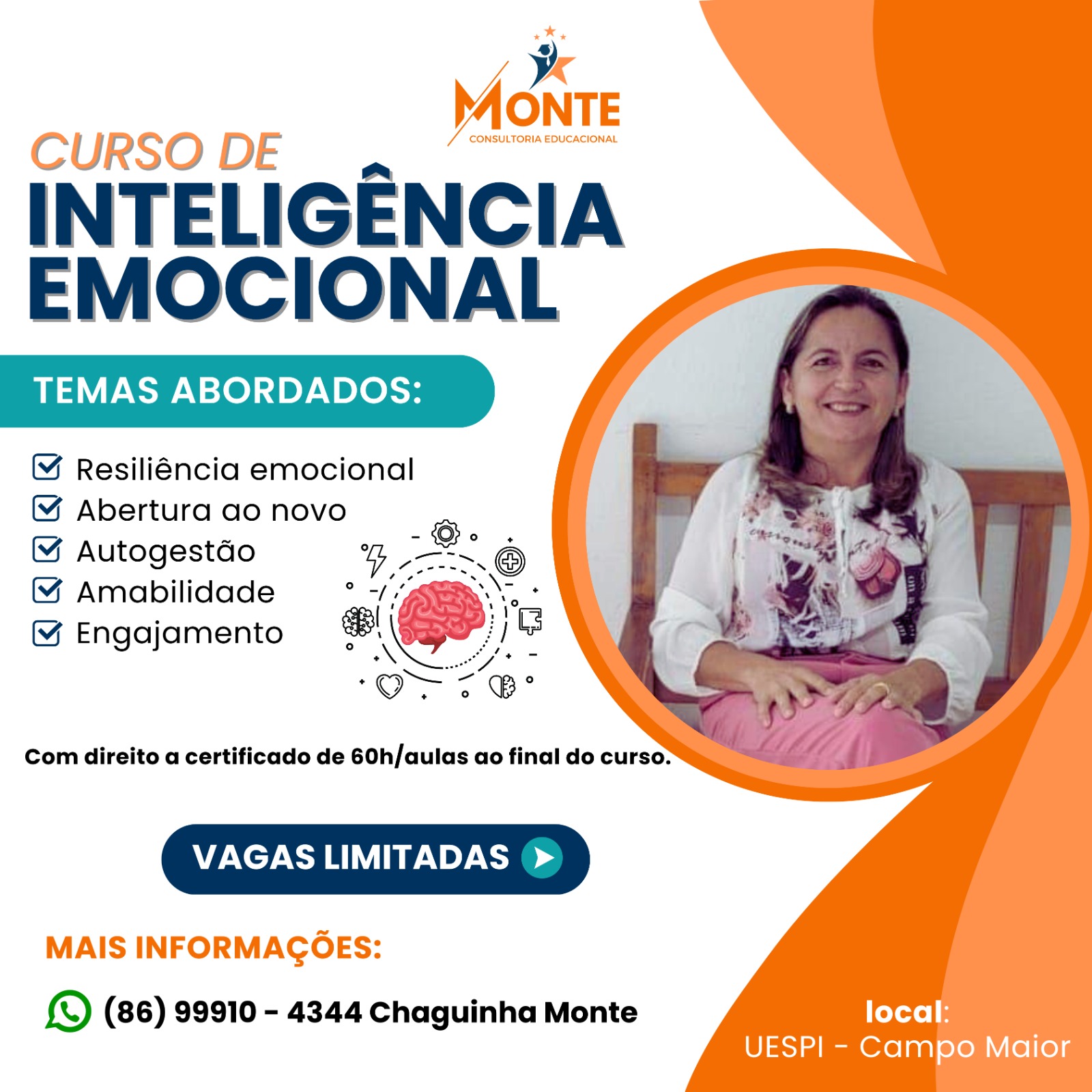 A professora Chaguinha Monte irá ministrar o curso de Inteligência Emocional em Campo Maior. O objetivo é preparar pessoas para serem profissionais mais qualificados e de sucesso, além de somar para a saúde e crescimento pessoal de cada um. Um certificado de 60h será entregue após conclusão.