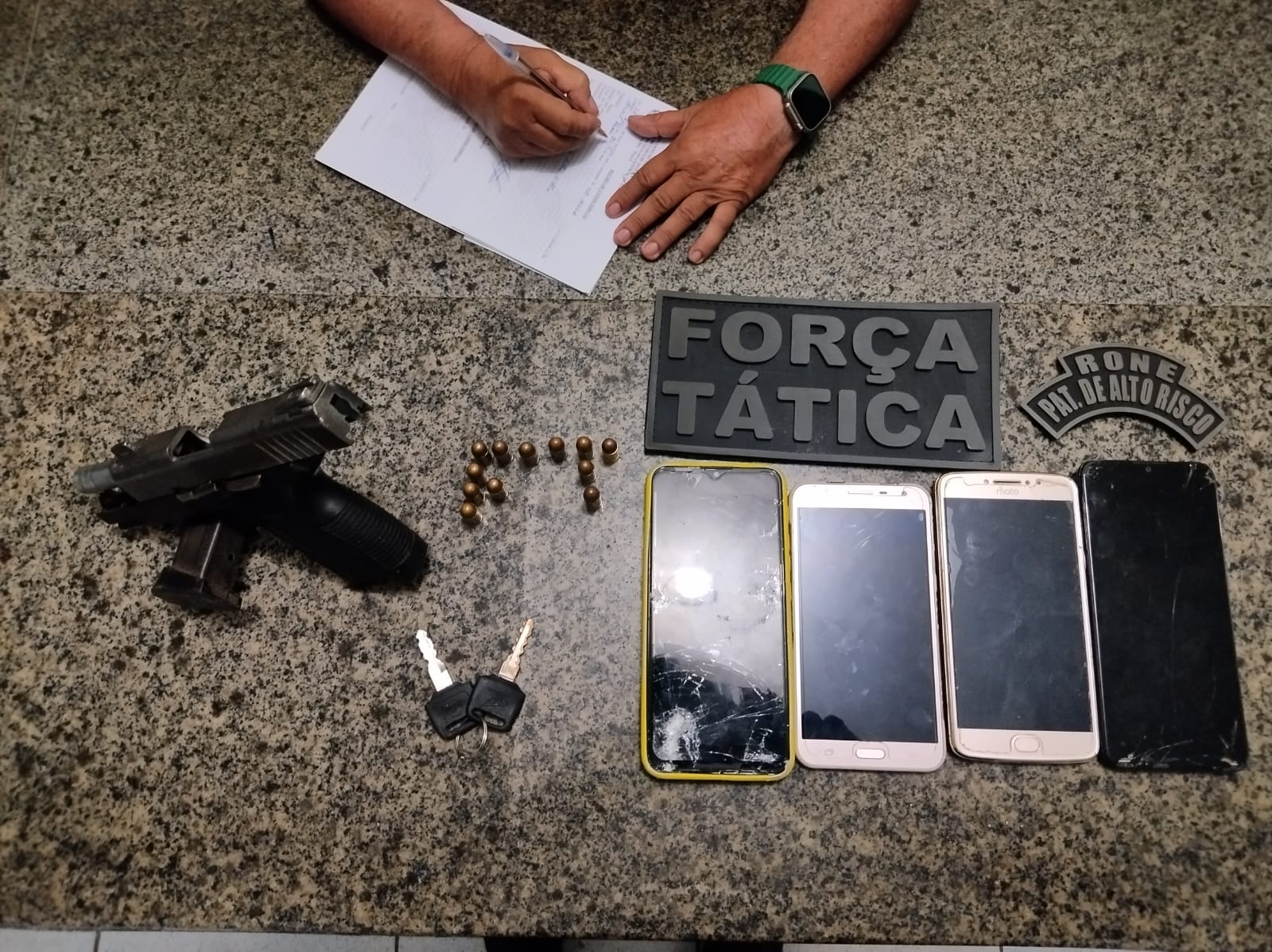Em seguida, foram avistados dois indivíduos, que logo após acompanhamento tático, foi dado voz de parada, porém não obedecida. Na fuga os suspeitos adentraram ao bairro Barro Vermelho e na sequência, derraparam e caíram em uma curva. Um dos indivíduos ficou no solo e com ele foi encontrado uma pistola Taurus 380 e os celulares.