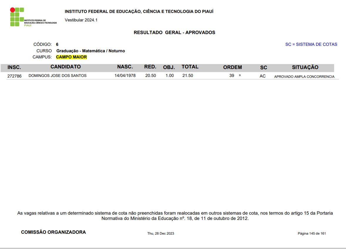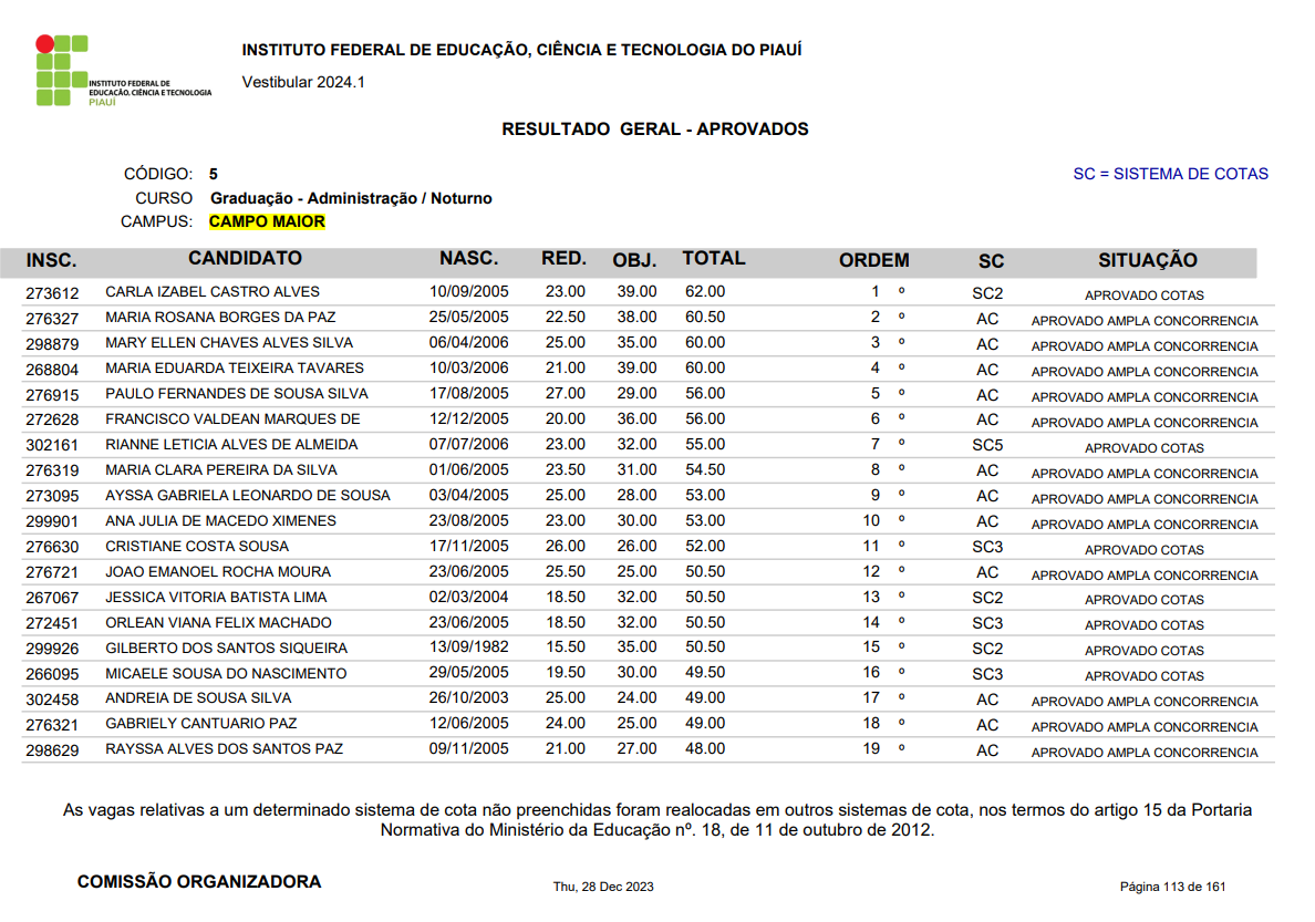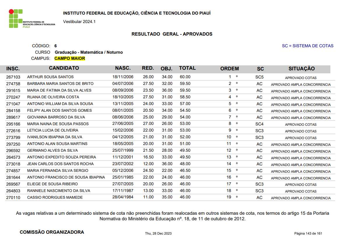 O Instituto Federal do Piauí (IFPI) divulgou, nesta quinta-feira (28.12) o resultado final do vestibular 2024.1. O campus Campo Maior ofertou vagas para os cursos de Bacharelado em Administração e Licenciatura em Matemática, sendo 40 vagas em cada um deles. As matrículas iniciam já no próximo mês de janeiro e as aulas em fevereiro.