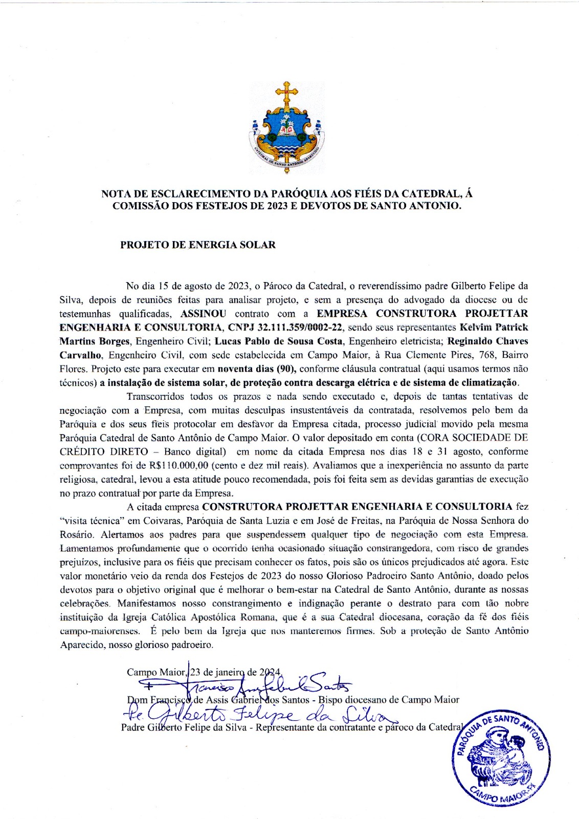 Uma empresa de energia solar teria dado um "calote" na paróquia de Santo Antônio de Campo Maior, que emitiu uma nota de esclarecimento nesta terça-feira (23.01) falando sobre o assunto. Mais de R$ 100 mil reais teriam sido pagos à contratada que, porém, não cumpriu com o acordado.