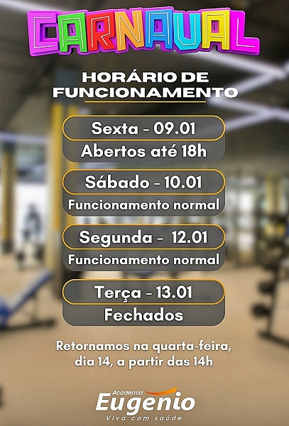 Veja o horário especial de funcionamento no carnaval da Academia Eugênio: