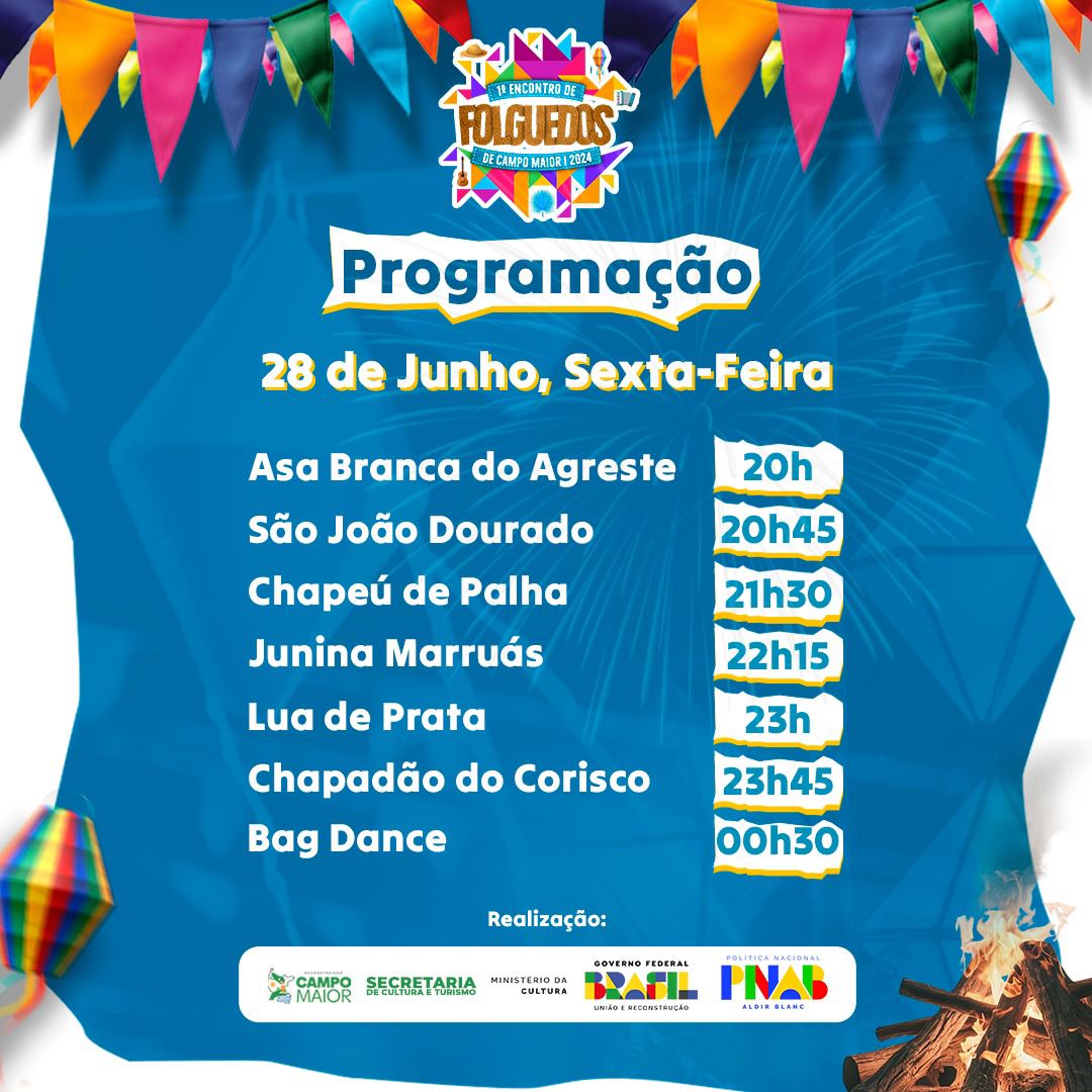 A Prefeitura de Campo Maior, através da Secretaria de Cultura e Turismo, e em parceria com o Governo Federal, por meio da PNAB (Política Nacional Aldir Blanc), vai promover o 1º Festival de Folguedos. O evento vai acontecer nos dias 28 e 29 de junho na Arena Cultural Tradições Vivas (antigo Espaço Cultural), a partir das 19h.