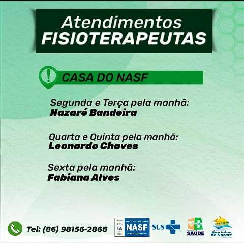 A população de Nazaré conta com atendimento de fisioterapeuta. Basta telefonar para o número: 98156 2868 e marcar o dia e a horário para ser atendido. Se preferir a marcação pode ser realizada ainda diretamente na sede do NASF.