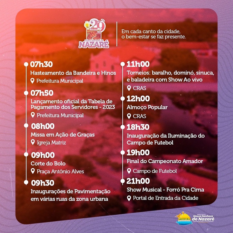 Nossa Senhora de Nazaré completa 29 anos de emancipação política no próximo dia 26 de janeiro. A prefeitura anunciou que está preparando uma programação especial.