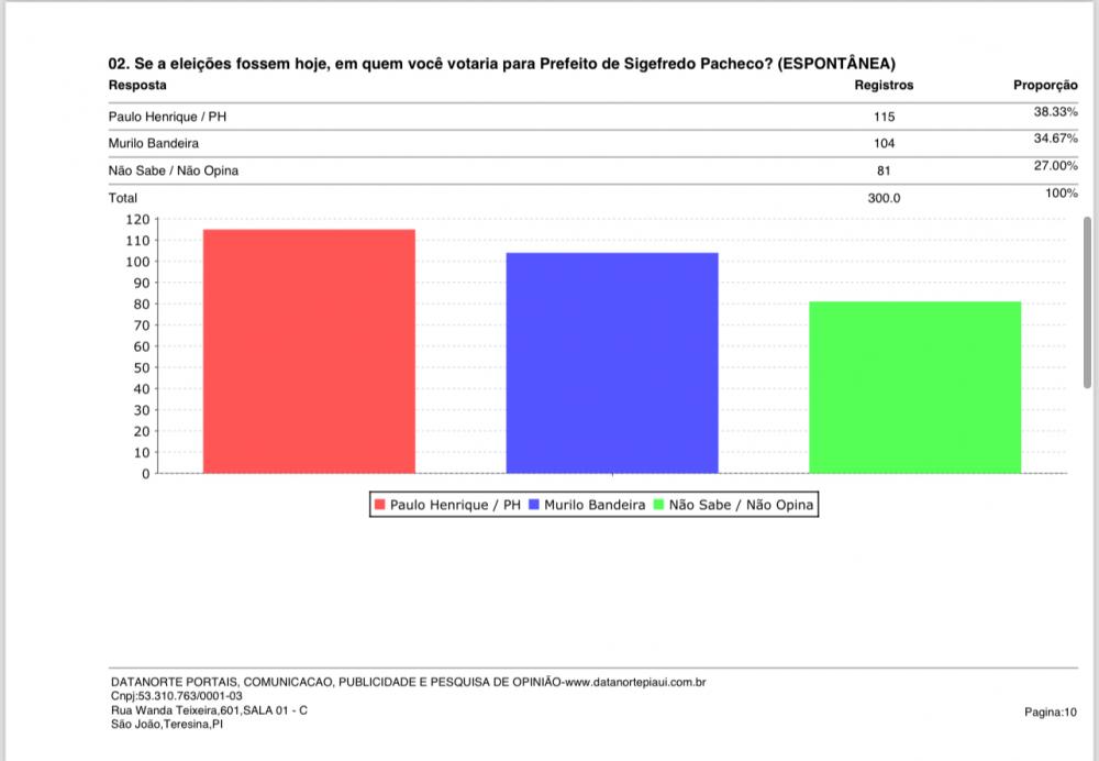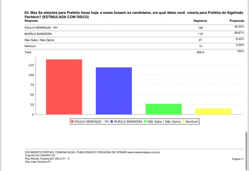 Uma pesquisa realizada pelo Instituto DataNorte aponta que o pré-candidato a prefeito de Sigefredo Pacheco, Paulo Henrique, está a frente do atual gestor Murilo Bandeira nas intenções de voto.