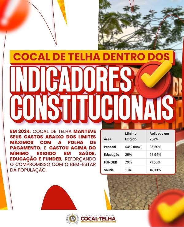 “Os resultados falam por si! De acordo com os indicadores constitucionais nacionais, em 2024, Cocal de Telha investiu acima do esperado em saúde e educação, garantindo mais qualidade de vida para a população. Além disso, a gestão seguiu um planejamento responsável e reduziu os gastos com pessoal, comprovando a eficiência e o compromisso com uma administração equilibrada e focada no bem-estar coletivo”, disse à mesma.